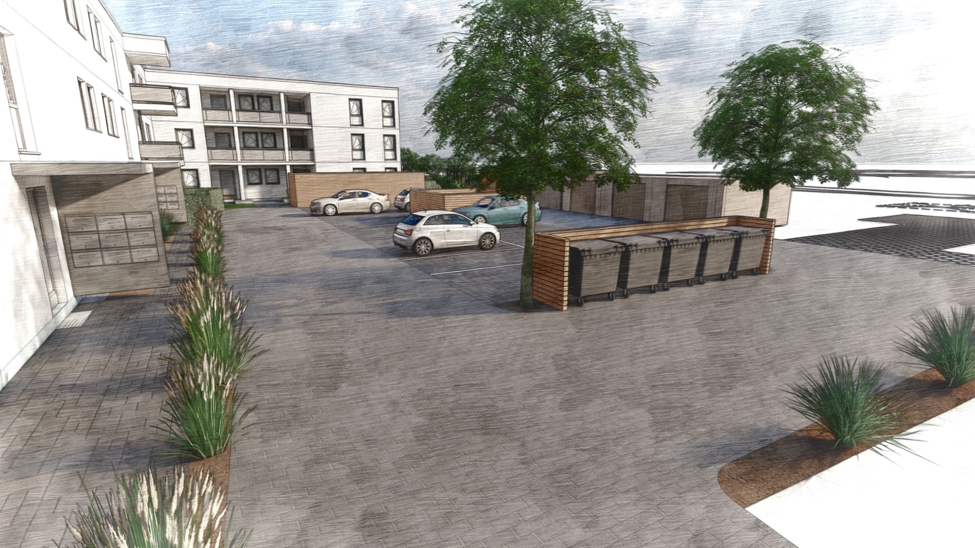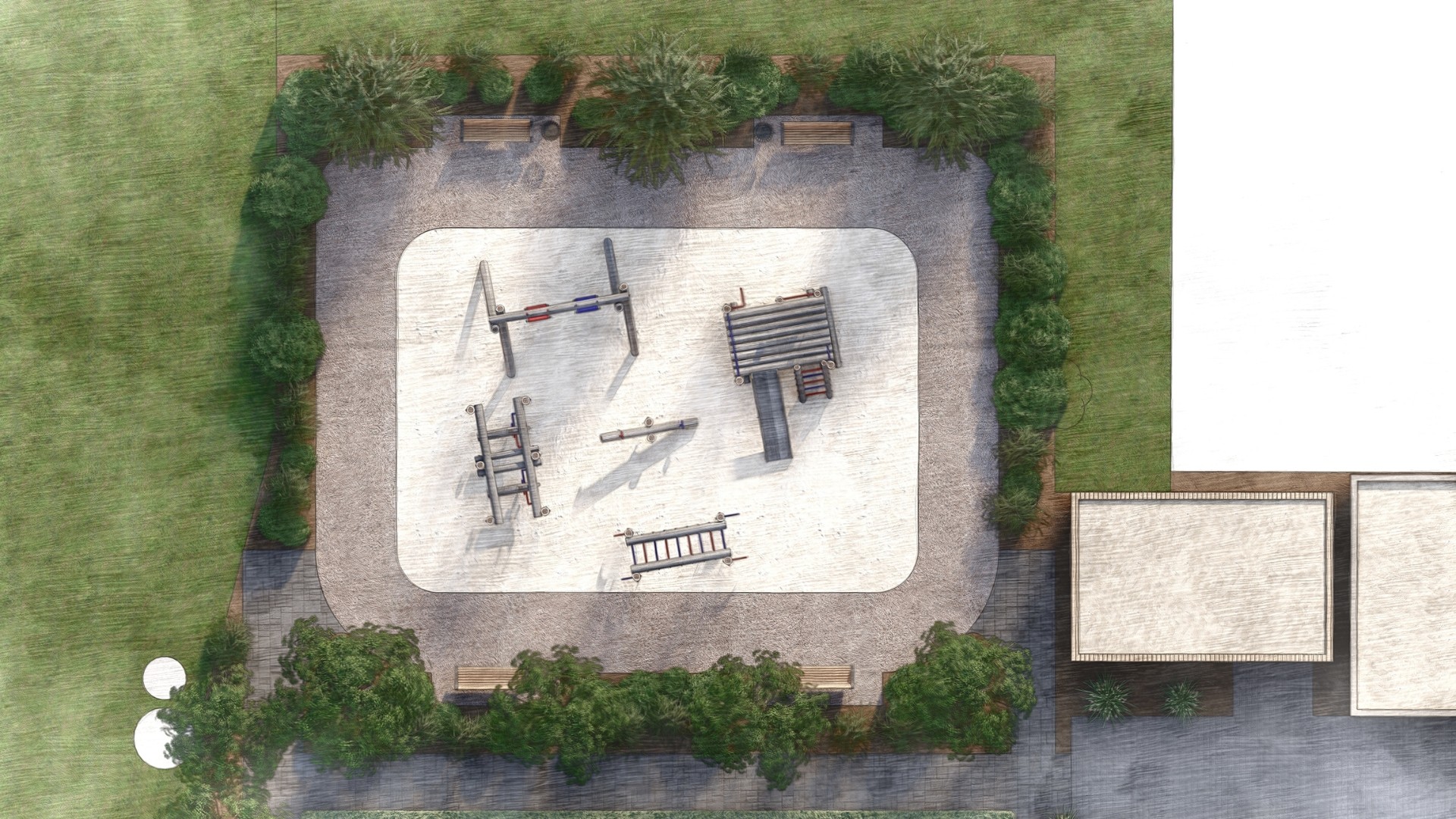 Dabei wurde besonderes Augenmerk auf die Verknüpfung von Verkehrsflächen, Aufenthaltsbereichen und Spielplatzzonen gelegt, sodass sowohl die funktionale als auch die ästhetische Wirkung des Außenraums frühzeitig erkennbar ist.