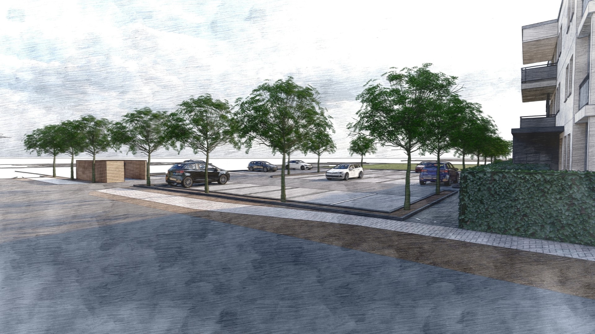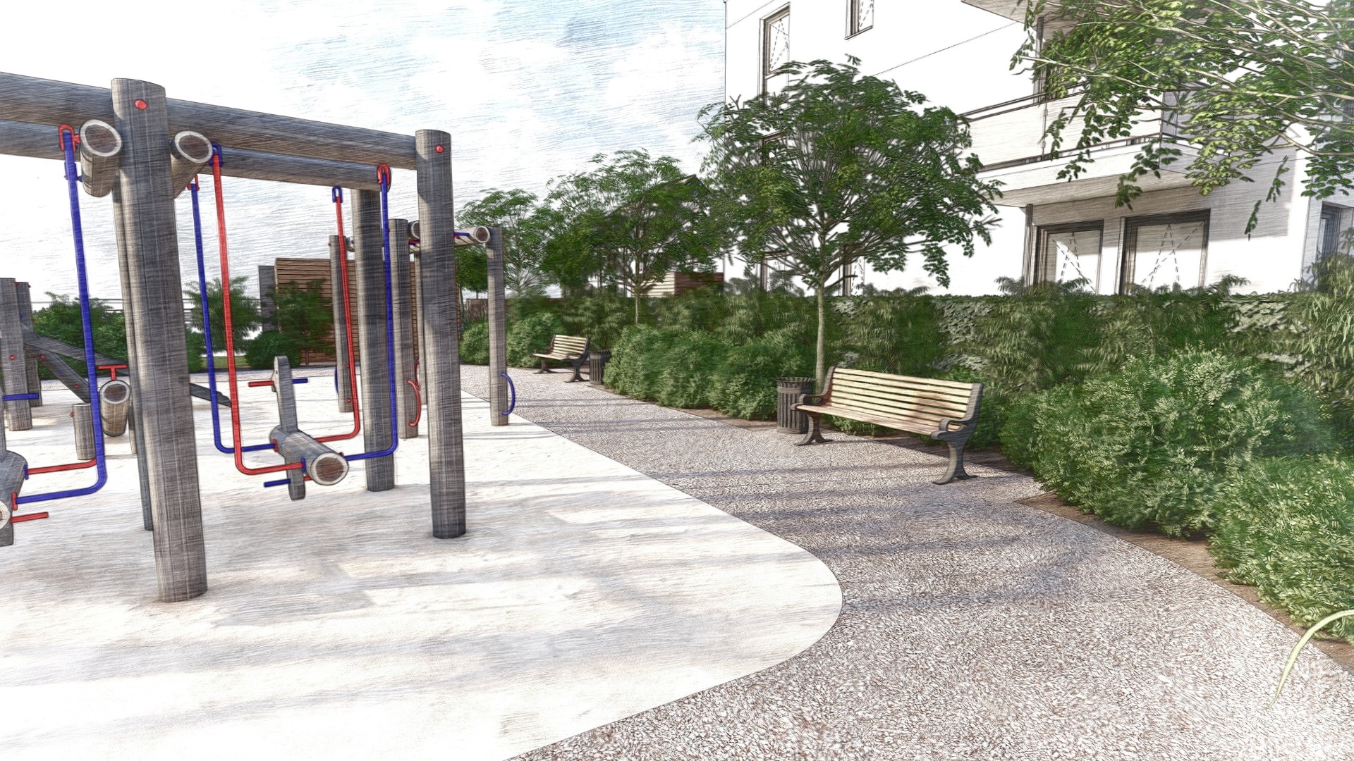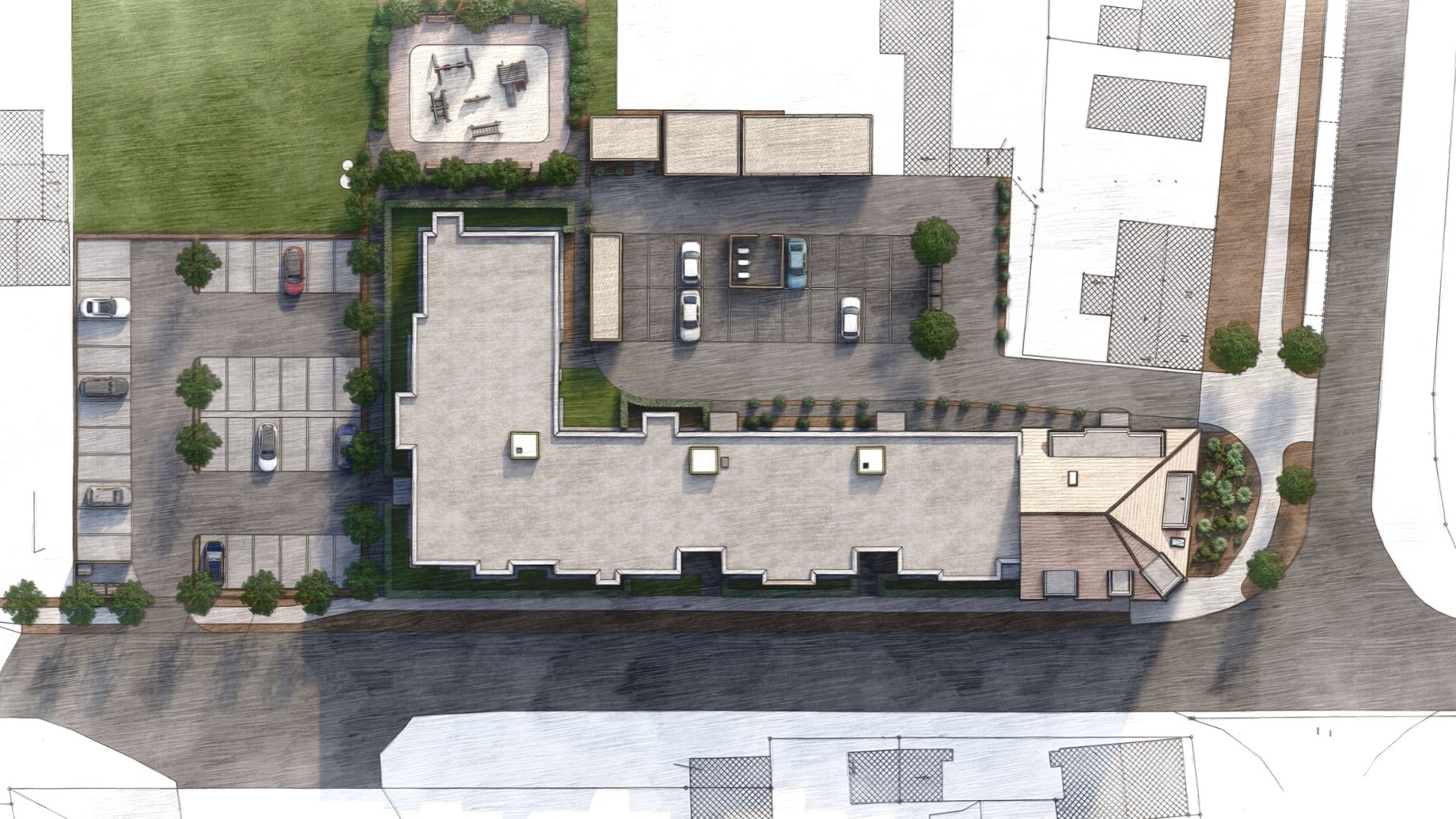 Aus der 2D-Vorlage heraus entstand ein detailliertes 3D-Modell, das die ursprüngliche Entwurfsidee nicht nur übernimmt, sondern in einen realitätsnahen räumlichen Bezug übersetzt. Durch die 3D-Visualisierung konnten Nutzerbereiche wie Parkplatzanordnung, Wegeverläufe und Spielplatzsituationen aus vielfältigen Perspektiven beurteilt und optimiert werden.
